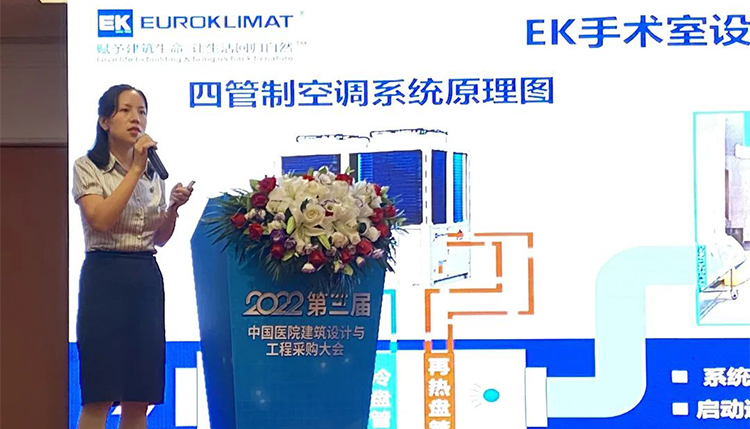 大會現場,EK空調(diào)水係統(tǒng)產品經理呂(lǚ)芳(fāng)玉以《EK熱(rè)回收(shōu)係(xì)統與您攜手共建環境友(yǒu)好型醫院》為主題發表演講。呂芳玉以(yǐ)廈門(mén)大學附(fù)屬翔(xiáng)安醫院為例,和(hé)大家詳細介紹了EK節能空調設備在不同(tóng)醫院場景的應用。