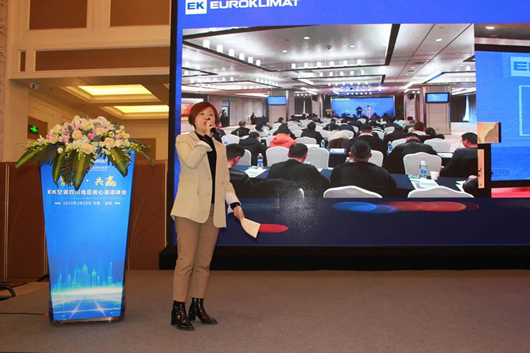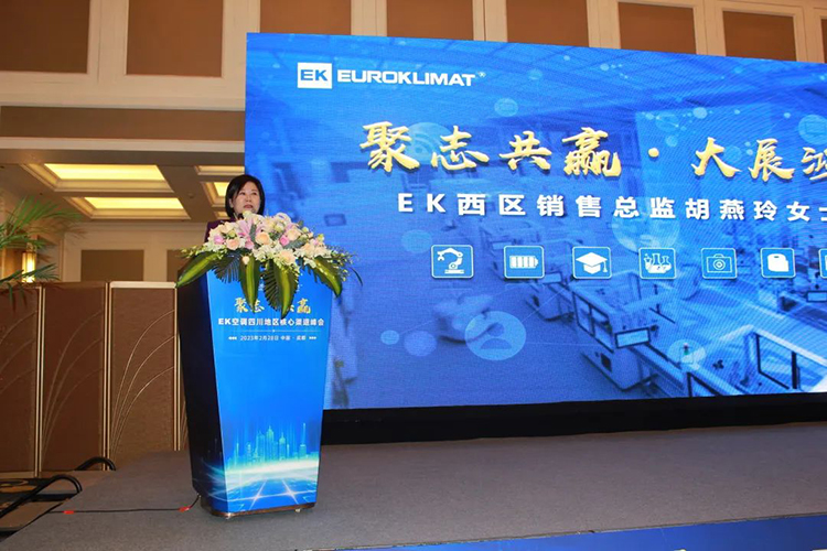 會議開始,EK空(kōng)調華西區區總胡(hú)燕玲首先致辭,她向(xiàng)在場嘉賓介紹了疫情(qíng)三年來EK空調(diào)在四(sì)川以及整個華西地區的業績增長情況,並(bìng)感謝各位經銷商長期以來的支持。希望在2023年,大(dà)家(jiā)可以把握市場(chǎng)機遇,一起再創佳績。胡燕玲強調:商家賺到(dào)錢,97视频才有市場。