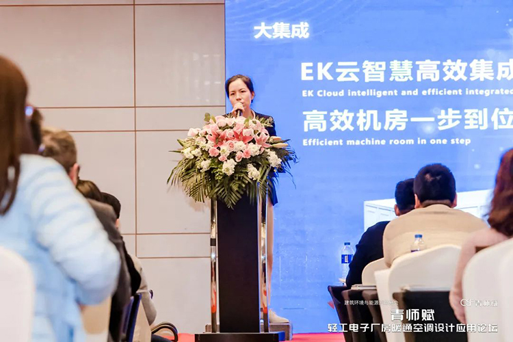 在本次論(lùn)壇上,行業大咖、企(qǐ)業代表與青年設計師們展開了深入(rù)交流,精準發力(lì)破解輕工電子領域建築暖通空調設計痛點。參會專家和企業代表們從不同角度分享了暖通空調產品在輕工(gōng)業領域的應用、解決方案和經驗。EK空(kōng)調產品經理呂芳玉帶來了以《EK雲智慧高效集成冷站在工業領域的應用》為主題的分享。