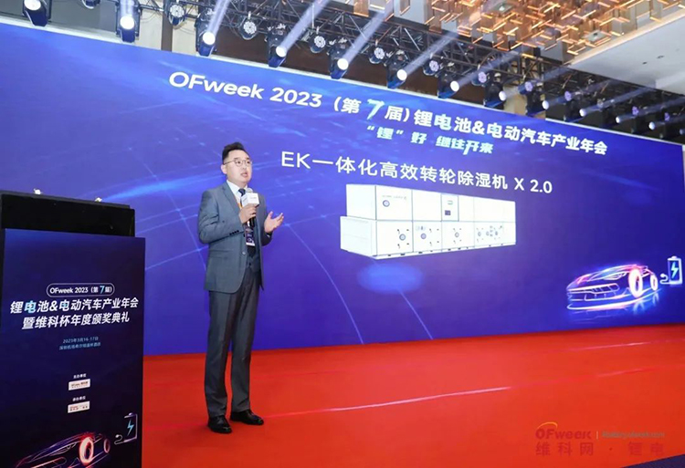 3月16日,OFweek 2023(第七屆)鋰電池(chí)&電動汽車產業年會暨維科杯·2022鋰電行業年度評選頒獎典禮在深圳拉(lā)開帷幕。EK作(zuò)為綠色鋰電工廠(chǎng)環境控製解決方案領先者,攜先進鋰電智造濕度環境節能解決(jué)方案亮相,並在現場發布(bù)重磅新品:一體化高(gāo)效轉輪除濕機(jī) X2.0。