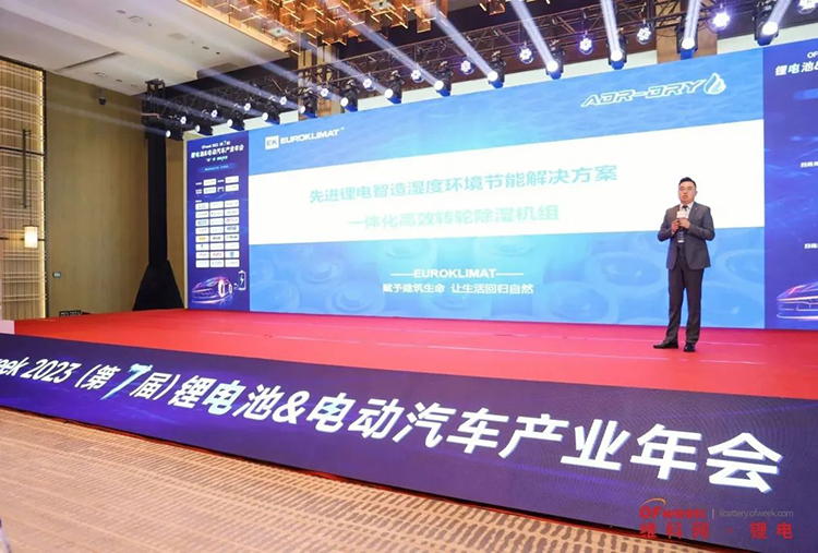 本次年會,EK IECD工業環(huán)境控製事業部總監王(wáng)健以《先進鋰電智造濕度環境節能解決方案》為主題發(fā)表演講,和大家詳細介紹了EK一體化高效轉輪除(chú)濕機 X2.0、EK雲智慧高效集成冷站等節能方案。