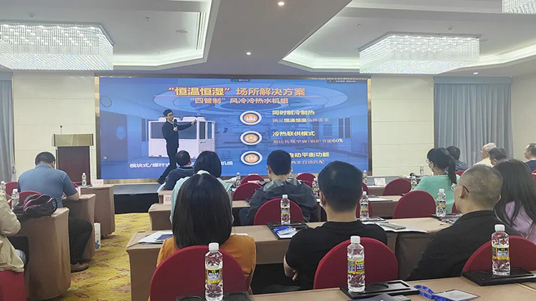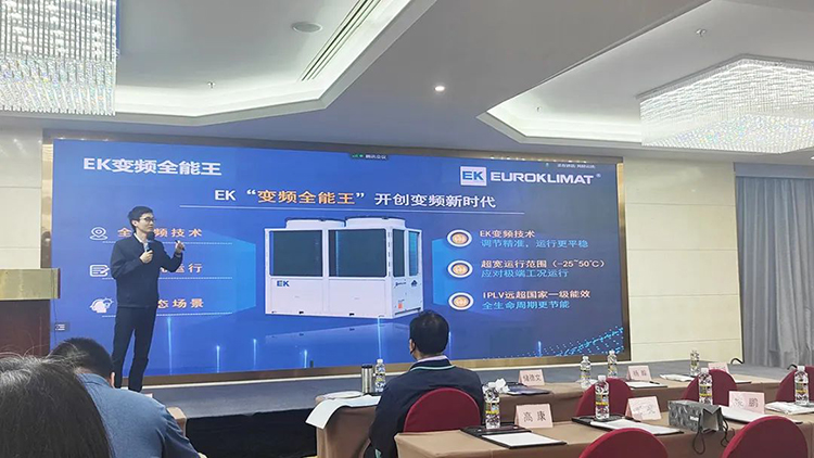 作為行(háng)業領先的中央空(kōng)調(diào)係統集成商和服務商,EK空調產品經理陳旭金在會上發(fā)表了《EK四管製冷熱水機組(zǔ)及變頻(pín)模塊解決方案(àn)》的主題演講,和現場嘉賓分享了EK四管製(zhì)在醫院手術室、遊(yóu)泳(yǒng)館、檔案館、博物館等“恒溫恒濕”場所的應用,以及EK變頻模塊的優勢特點、應用(yòng)案例、應用場景。