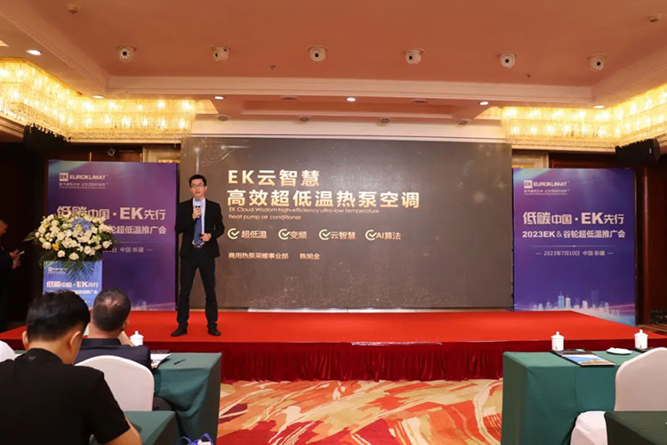 EK空調產品經理陳旭金則以《EK雲智慧高效超低溫熱泵空調》為主題,和(hé)現場嘉(jiā)賓介紹了普通風冷熱泵和超低溫(wēn)空氣(qì)源(yuán)熱泵的區別,EK超低溫熱泵(bèng)的發展曆史、產品陣容、係統優勢以及在嚴寒地區各行業的應用案例。