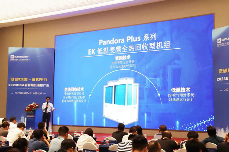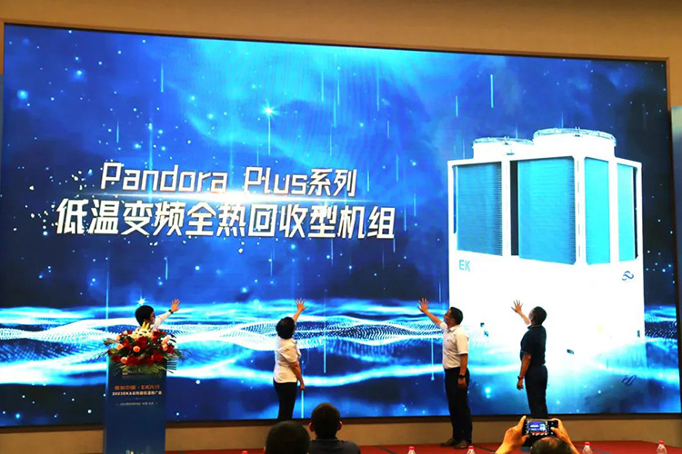 會議現場,EK空調商用熱泵采暖事業部產品(pǐn)經(jīng)理(lǐ)陳旭金和現場嘉賓介紹了EK全熱回收技術的(de)優勢、特點以及在酒店行(háng)業的應用,並(bìng)隆重推出Pandora Plus 係列低溫變頻全熱回收型機組。該(gāi)機組集變頻技術、全熱(rè)回收技術、低溫技術為(wéi)一(yī)體,采用變(biàn)頻智(zhì)慧(huì)運行策略和EVI噴氣增焓(hán)係統,可在-25℃低溫環境(jìng)中高效穩(wěn)定的運(yùn)行。