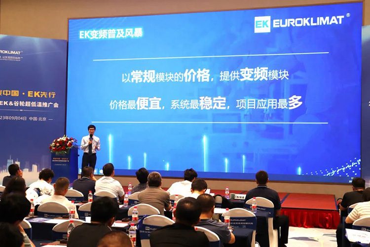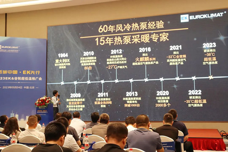 9月4日(rì),低碳中(zhōng)國·EK先行——2023 EK&穀(gǔ)輪超低溫推廣會在北京隆重舉行。EK空調京津區區總陶文忠、商用熱泵采(cǎi)暖事業(yè)部總監沐東平、北京辦事處總經理鄒林、北京集團客戶部總經理張傑、商用熱泵采暖事業部產品經理陳旭金、商用熱(rè)泵(bèng)采暖事業部研發經理李鵬等領(lǐng)導,穀(gǔ)輪環境技術有限公司市場部經理季磊以(yǐ)及(jí)來自北京地(dì)區(qū)的120餘名EK核心經(jīng)銷商齊聚(jù)一堂,共襄發展。中國勘察設計協會建築環境與能(néng)源應用分會、國防委員會副主任委員、中(zhōng)國電子係(xì)統工程第二建設有限公司暖(nuǎn)通顧問郭蓉等行業專(zhuān)家應(yīng)邀出席。