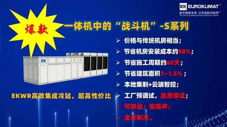 此次會議,EK首次推出了(le)號稱一體(tǐ)機中的“戰鬥機”——S係列雲智慧高效集成冷站,該係(xì)列(liè)集成(chéng)冷站最大的優勢就是采用EK自製冷卻塔,超高性(xìng)價比,價格與傳(chuán)統(tǒng)機房的造價相當,安裝(zhuāng)成本節省約50%,且冷卻塔與主機(jī)段采用一(yī)體化設計,是真正意義上的一體機。