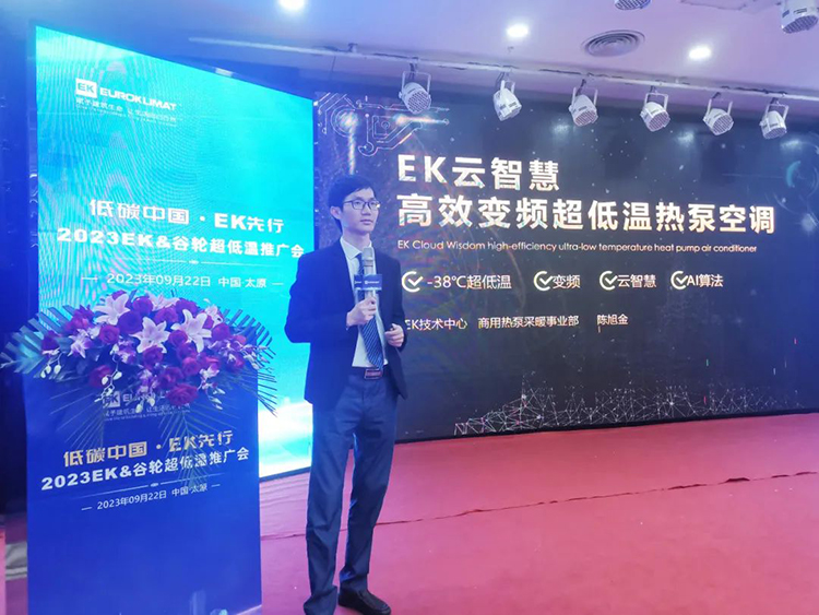 推廣會現場,EK空調商用熱泵采暖事業部產品經理(lǐ)陳旭金和現場(chǎng)嘉賓介紹了EK超低溫熱泵的發展曆史、產品陣容、係統優勢以(yǐ)及在嚴寒地區(qū)各行業的應用案例。