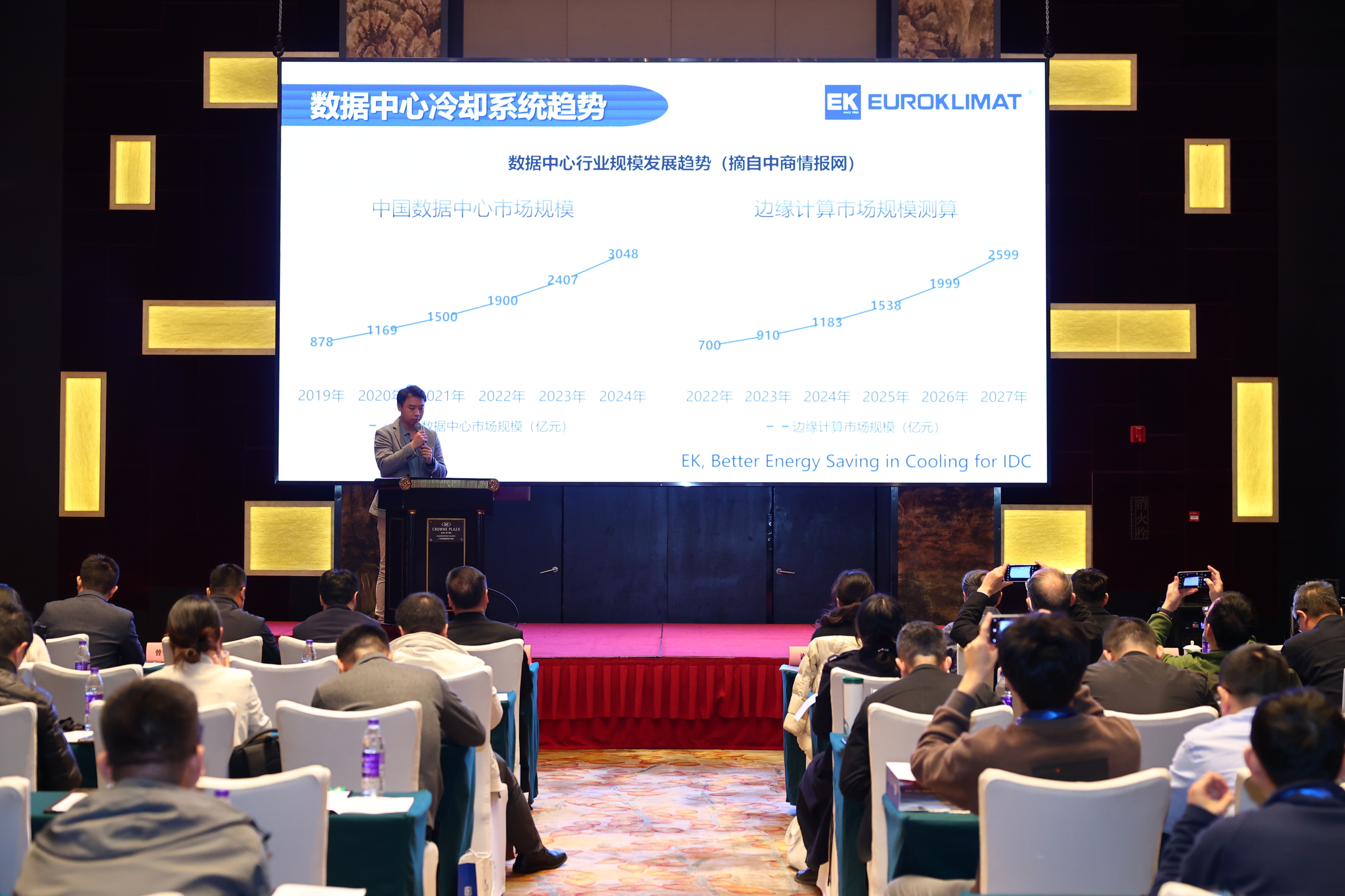 在國家“新基建”“數字化轉型”和“數字中國遠景目標”等政策的推動下,我國數據中心市場呈現出蓬勃發展的(de)態勢,但也麵臨著高能耗的問題。蒸發冷卻(què)技術作為節能、環(huán)保(bǎo)、綠色、低碳的製冷技術,成為了行業(yè)節能應用熱點。在演講中,古正中(zhōng)詳(xiáng)細介紹了EK的(de)間接蒸(zhēng)發冷卻機組製冷解決方案和蒸發(fā)冷無油懸浮氟泵多(duō)聯製冷解決方案,為行業帶來(lái)了EK在蒸發冷技術方麵的思路和解決方(fāng)案。