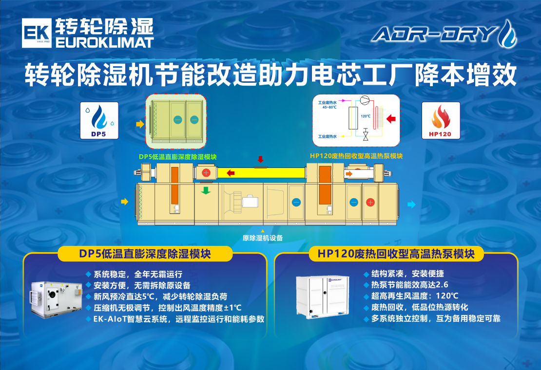 基於此,EK中國(guó)區市場總監兼IECD事業部(bù)總監王健發表(biǎo)了主題為《轉輪除濕機節能改造助力電芯(xīn)企業降(jiàng)本增效》的演講,介紹EK工業空調(diào)的除濕機(jī)節能改造方案,並重點推介了EK工業空調在轉輪除(chú)濕機領域的(de)兩大核心技術——DP5低溫直膨深度除濕(shī)模塊、HP120廢熱回(huí)收型高溫熱泵模塊。