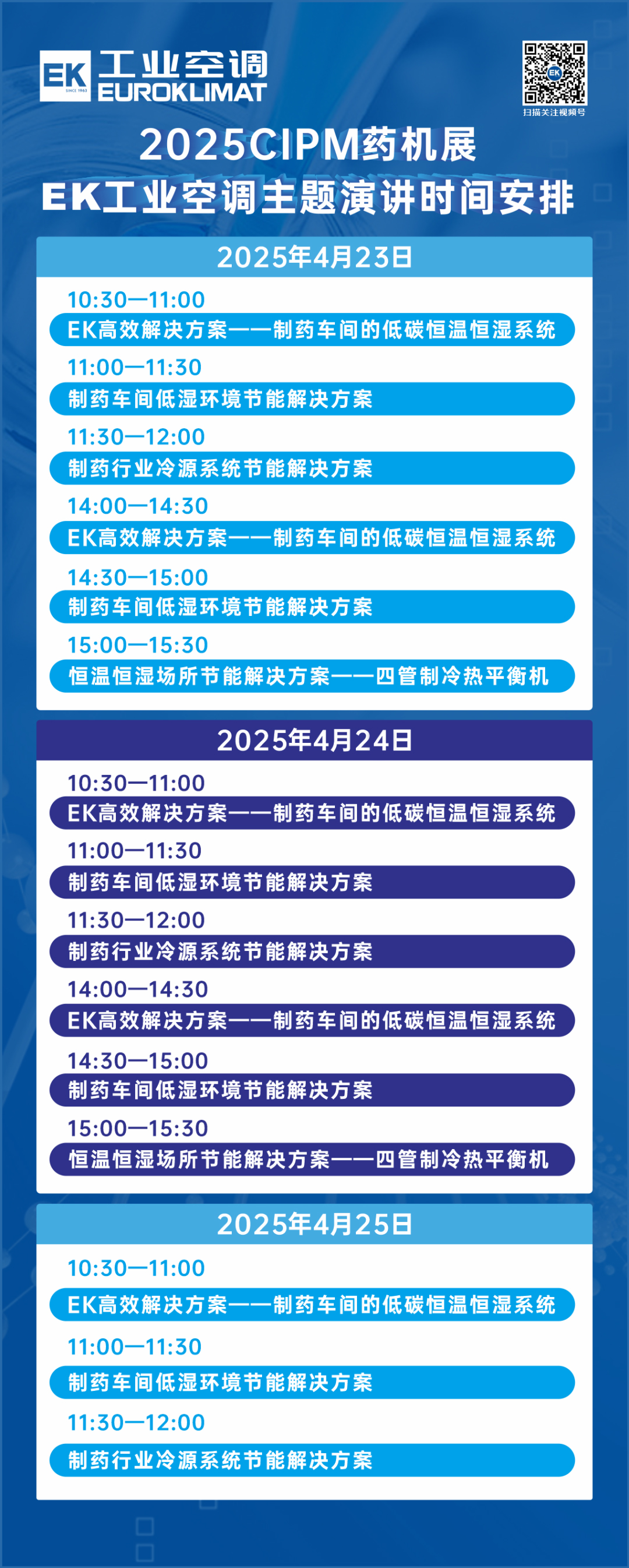展會熱度持續攀(pān)升,精彩遠(yuǎn)不止於此!本屆藥機(jī)展將持續到4月25日,EK工業空調誠邀您蒞臨國際三館 S3-59 展位,共探製藥行業節(jiē)能降耗、綠色發展(zhǎn)路徑!
