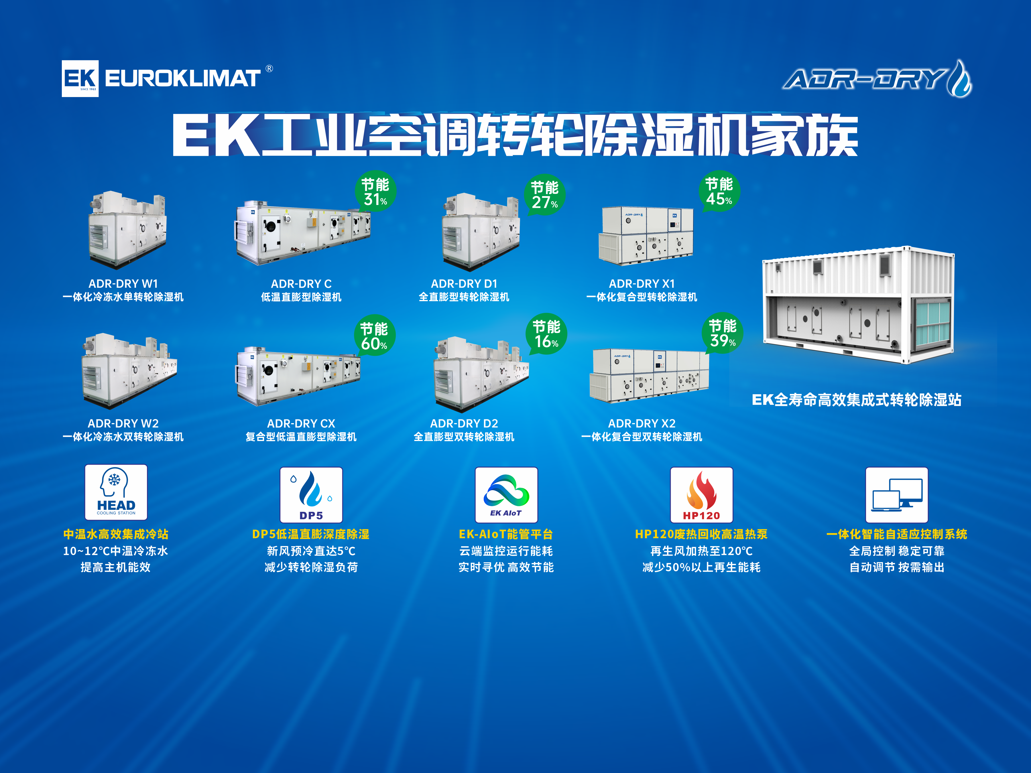 針對這一技術痛點,EK工業空調依托自主核心技術研發(fā)團隊,創新(xīn)研發EK一體化高效(xiào)低露(lù)點轉輪(lún)除濕(shī)係統,將(jiāng)傳統轉輪除濕技術與低溫出風直膨除(chú)濕技術、餘熱回收高溫(wēn)熱泵的轉輪再生技(jì)術高效集成,結合一體化智能自適應控製係統的協同控製,搭載EK-AIoT工業物聯網能源優化管理平台的運行監測和自動尋優功能,送風(fēng)露點最低可達(dá)-80℃,滿足工業領域低(dī)露點(diǎn)需求除濕係統(tǒng)節能率(lǜ)最高可達60%,助(zhù)力企(qǐ)業實現低碳生產,降低企業運營(yíng)成(chéng)本。