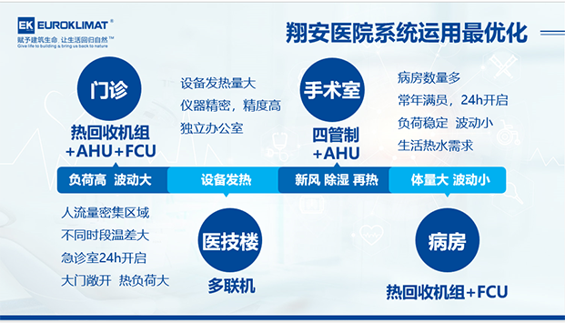 翔安醫院主要分為門診、醫技樓、手術室、住院部四大區域,根據不同場景的不同需求,EK分別為(wéi)其定製最優化、最節能的中央空調係統解決方案,為醫院一站式解決製冷、製熱、潔淨、新風、恒溫恒(héng)濕、生活熱水等問題。