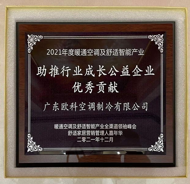 在(zài)2021年度(dù)暖通空調及舒適智能產業品牌企業榮譽榜單發布環節(jiē)中,廣東歐(ōu)科空調製冷有限公司榮獲“助推(tuī)行業成長公益企業優秀貢(gòng)獻”稱(chēng)號。